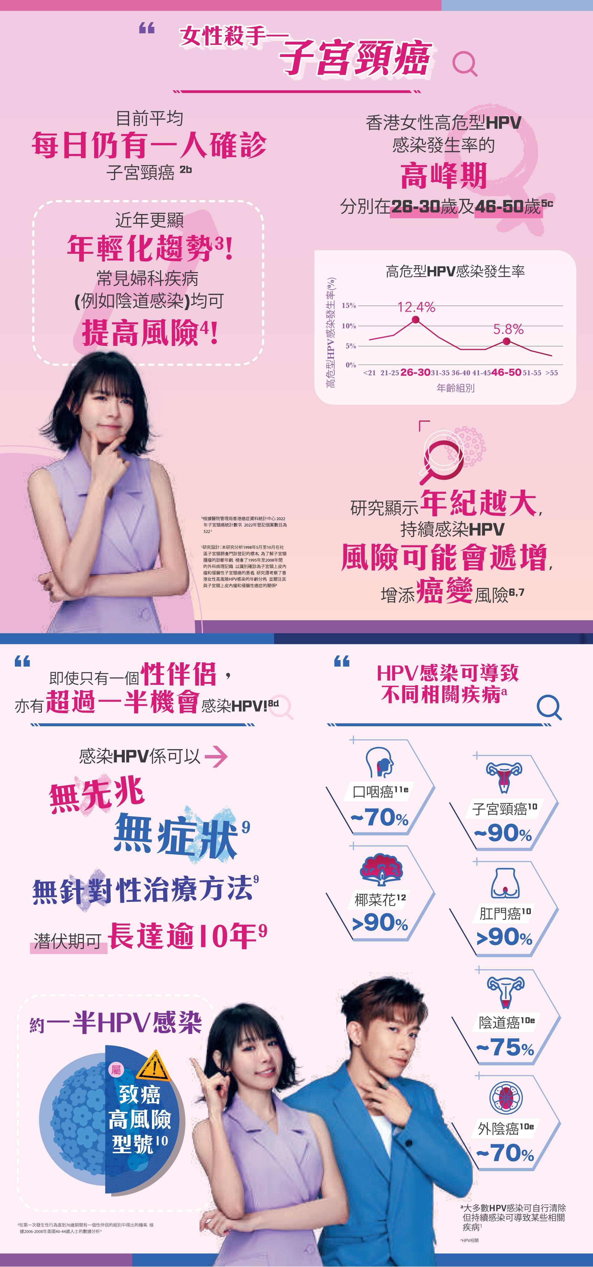 部分HPV 病毒會透過性接觸傳播,感染人類的生殖器官及附近皮膚,就算使用避孕套也無法100%避免。HPV疫苗(全稱為人類乳頭瘤病毒疫苗,又稱子宮頸癌疫苗)是一種預防性疫苗,接種後能有效預防子宮頸癌及其他因感染HPV而引致的癌症和疾病。在香港,約九成的子宮頸癌和生殖器官濕疣(俗稱椰菜花) 是由HPV-6, 11, 16, 18, 31, 33, 45, 52, 58型病毒感染而引起,而9價疫苗有助抵抗以上9種HPV基因型病毒。