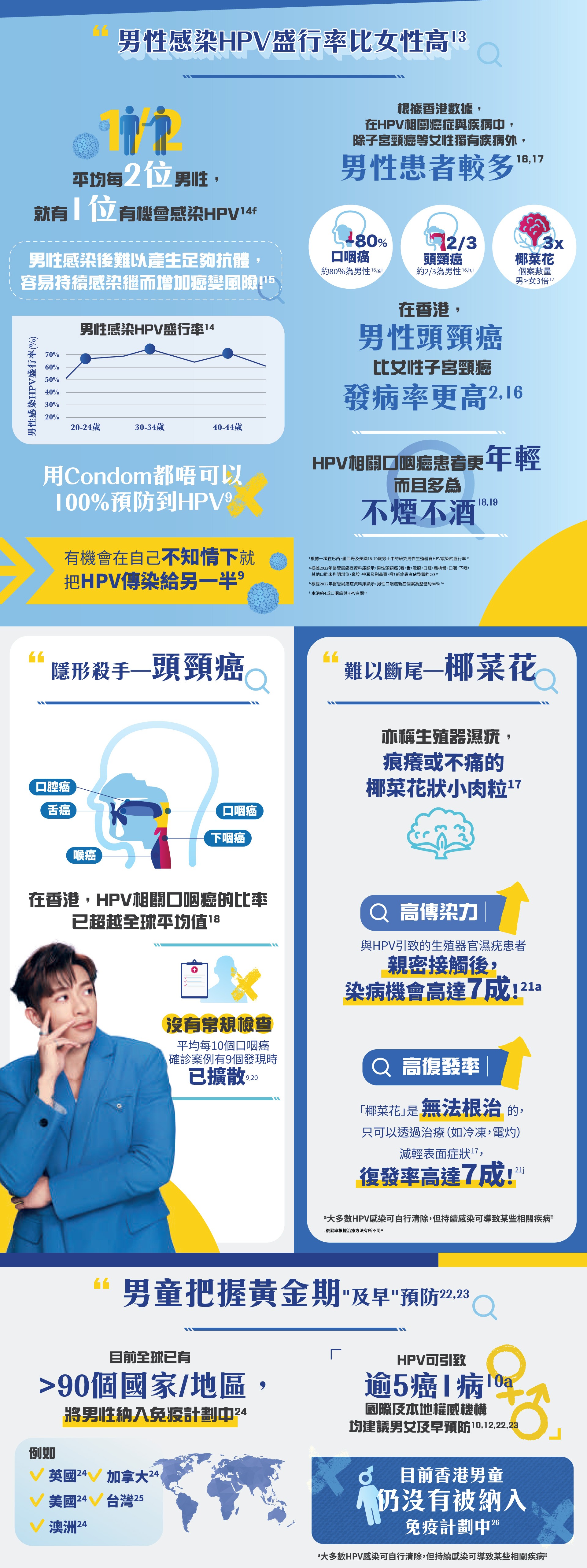 HPV中文全名為人類乳頭瘤病毒,是一種不論男女都有機會受感染的病毒。目前約有200種類型被判別出來,不同種類HPV會導致不同病症。有資料顯示男性感染HPV風險其實比女性高,成年男性感染機率可高達65%。受感染男性將HPV傳染給女性風險比女傳男高出5倍,而感染HPV可導致子宮頸、陰道、外陰及肛門的癌前病變及癌症,以及其他疾病。